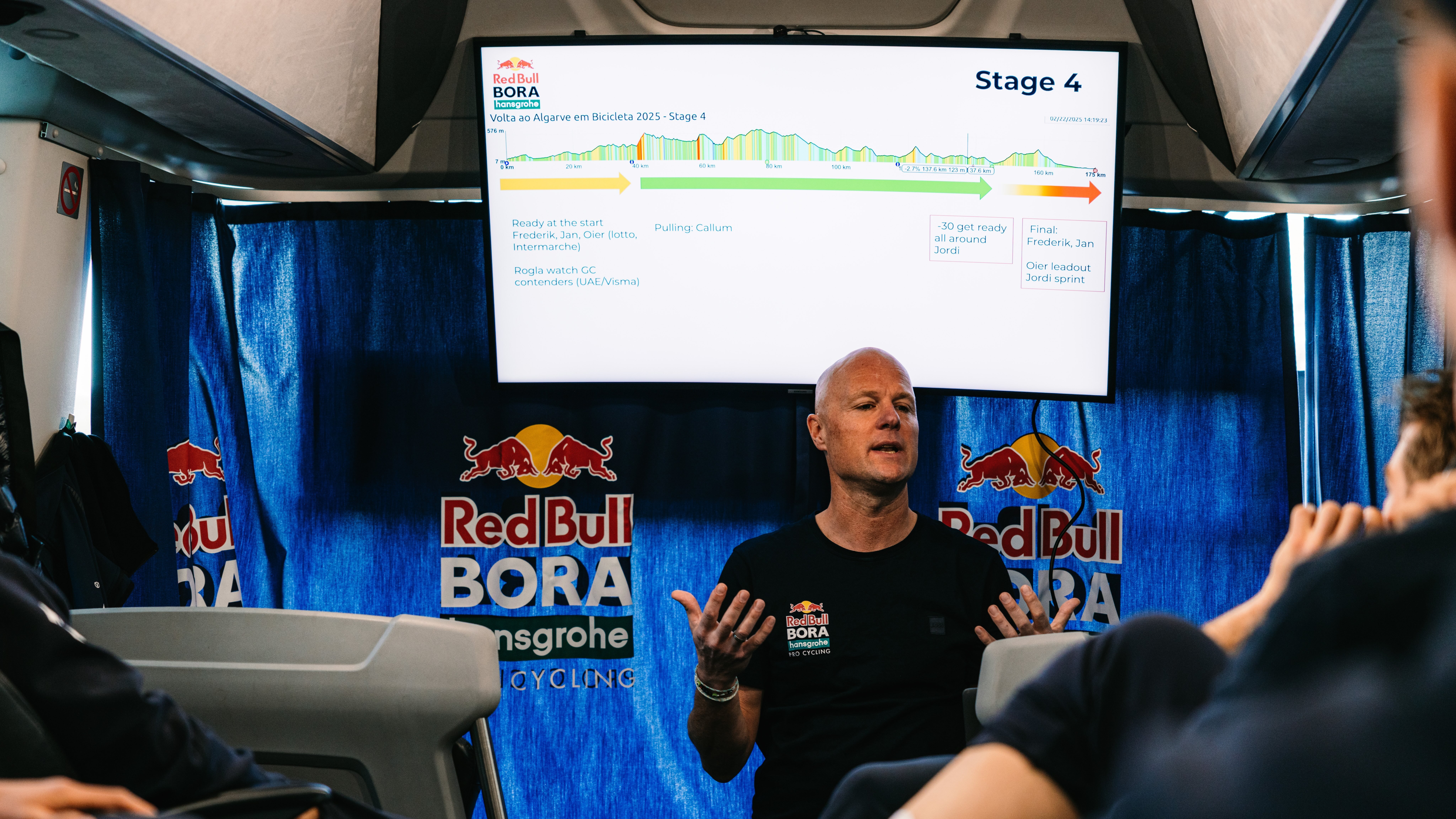 Mein wichtigster Ansatzpunkt ist es, auch bei vermeintlich unwichtigen Etappen jedem Fahrer eine sehr genaue Aufgabe zu geben, idealerweise eine, bei der er das Gefühl hat, auch für seine persönlichen Interessen zu kämpfen. Sich selbst zu verwirklichen. Ein weiterer für mich bedeutender Aspekt ist, den jeweiligen Leader zu ermuntern, immer ehrliches Feedback zu geben. Ungefiltert. Im Debriefing. Vor versammelter Truppe. Natürlichen Leadern fällt das leicht. Davon gibt es aber wenige. Viel häufiger ist es meine Aufgabe als Sportlicher Leiter, die nötigen Informationen zu sammeln und meinem „Anführer” zu zeigen, wie er am wirkungsvollsten Feedback geben kann.